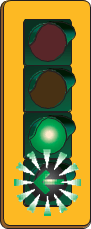 Flashing green arrow with a steady green light — may turn in the direction of the arrow or proceed