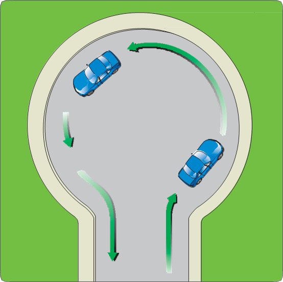 Sometimes you can turn around by doing a series of turns at intersections or by turning in a cul‑de‑sac. You may also be able to do a U‑turn or a two‑point turn or a three‑point turn.