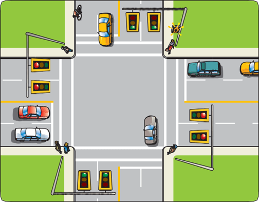 Intersections are places where a number of road users cross paths. There is often a lot of activity in intersections, so it’s important to be alert. Remember that other road users may be in a hurry, and may want to move into the same space that you are planning on moving into.