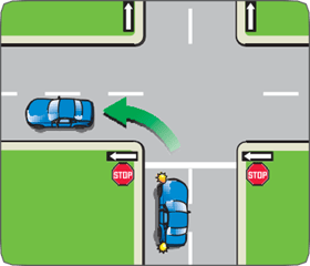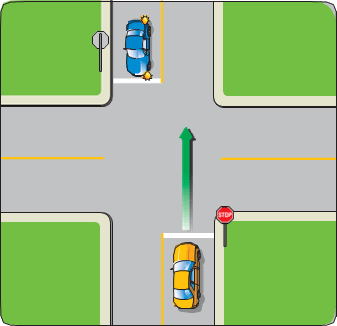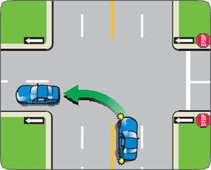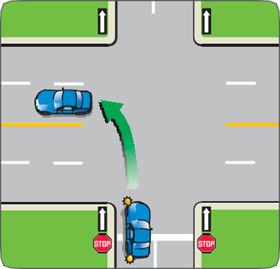 - If two vehicles are facing each other and have arrived at the intersection at about the same time, the one making a left turn must yield to the one going straight through.
