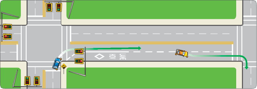Be careful when you want to turn left where other traffic is approaching from the opposite direction. Yield to traffic that is in or near the intersection. If you intend to go straight through and a vehicle is already in the intersection turning left, you must yield.