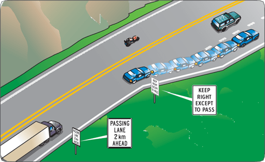 A sign will tell you when the passing lane is about to end. Vehicles in the right lane and the passing lane must merge before the passing lane ends.