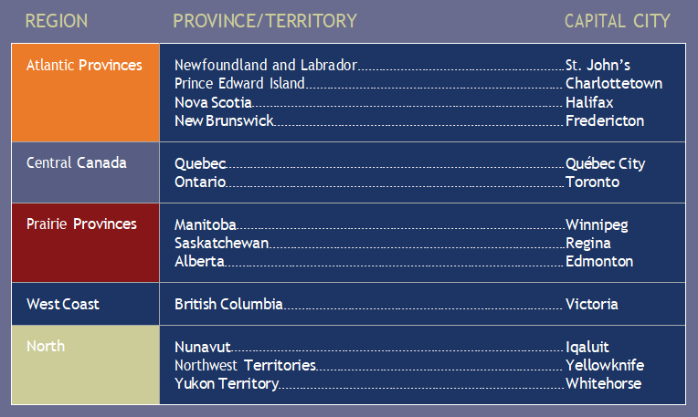 Canada has ten provinces and three territories. Each province and territory has its own capital city. You should know the capital of your province or territory as well as that of Canada.