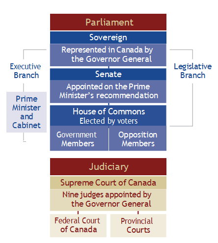 Parliament has three parts: the Sovereign (Queen or King), the Senate and the House of Commons. Provincial legislatures comprise the Lieutenant Governor and the elected Assembly.