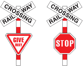 Railway level crossings that aren’t controlled by signals, bells or barrier arms may be controlled by a Stop sign or a Give Way sign.