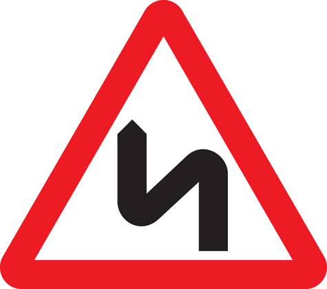 Double bend first to left (symbol may be reversed)Bend to right (or left if symbol reversed)RoundaboutUneven roadPlate below some signsTwo-way traffic crosses one-way roadTwo-way traffic straight aheadOpening or swing bridge aheadLow-flying aircraft or sudden aircraft noiseFalling or fallen rocksTraffic signals not in useTraffic signalsSlippery roadSteep hill downwardsSteep hill upwards