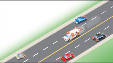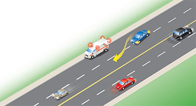 Use extreme caution when stopping your vehicle because other drivers may not yet be aware of or are already reacting to the approaching emergency vehicle. Look to the front, both sides and toward the rear of your vehicle, signal your intention to pull over well in advance and begin to adjust your vehicle’s speed to merge with any traffic to the side you are pulling to. Once you have moved your vehicle to the side, brake gradually as required and bring your vehicle to a safe stop. Avoid any sudden changes in direction or excessive braking and be aware of any vehicles approaching fast to the rear of your vehicle.