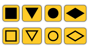 There are four shapes — square, triangle, circle and diamond — but each can be shown filled or in outline, making eight distinct symbols. Close to motorway junctions, and on roads near to or following the line of a motorway, they are commonly placed on direction signs.