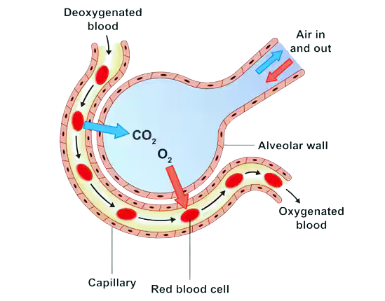 Alveolar Gas Exchange: Oxygen and carbon dioxide are exchanged between the air in the alveoli and the capillaries surrounding them.