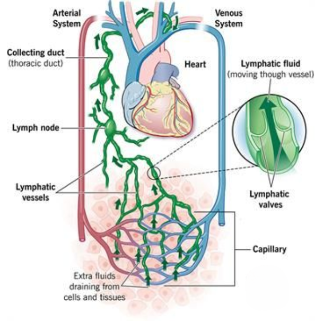 - Helps transport substances between blood and cells by clearing interstitial fluid (the fluid surrounding cells).